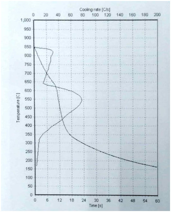 淬厚大件高鉻鑄鐵適宜的ZFQ-A型淬火劑的濃度:原液與水配比1:6,其 大冷卻速度150C/s——200C/s之間, 大冷卻速度所在的溫度在7800C——8300C之間,在3000C的冷卻速度小于6.50C/s,在3000C到2000C馬氏體轉(zhuǎn)變溫度區(qū)域內(nèi)所用時(shí)間大于20秒(S),(采用冷卻介質(zhì)測(cè)定儀測(cè)定,測(cè)定溶液溫度300C,)。
