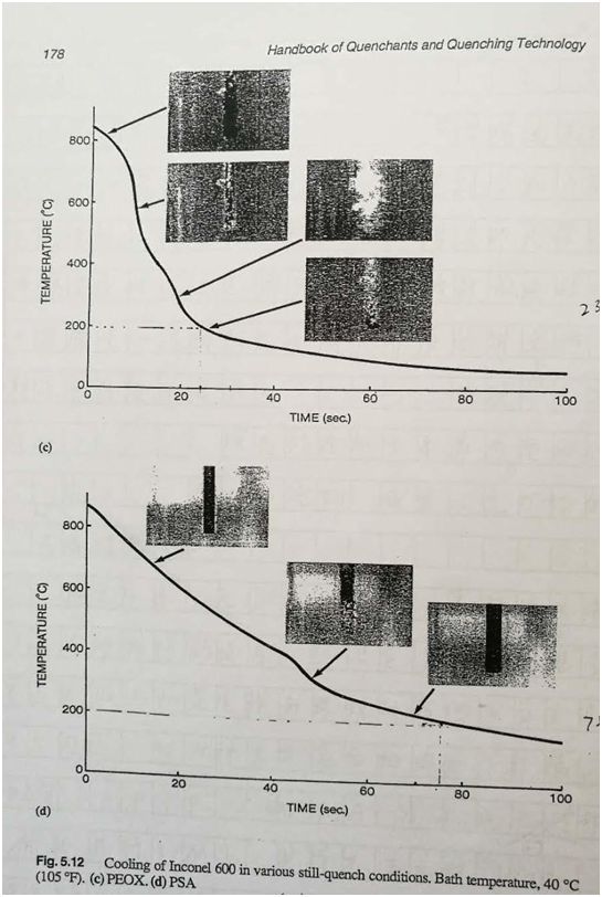 淬火介質(zhì),無(wú)論是油、水、聚合物水溶液,其冷卻機(jī)理的改變,起決定作用的是熱金屬表面上液體和蒸汽膜性的影響。為了證明這個(gè)這個(gè)問(wèn)題,對(duì) 4 種主要聚合物淬火介質(zhì):PAG、PVP、PEOX 和 PSA 的 A、B、C三個(gè)冷卻階段進(jìn)行了研究,具體辦法是對(duì) lnconel 600 探頭淬入介質(zhì)后,在它的金屬和溶液界面上發(fā)生的現(xiàn)象進(jìn)行照相。圖 2(a)、(b)、(c)、(d)分別表示了這些照片被疊加到真實(shí)的冷卻曲線上。圖 2 中部曲線是在靜止的濃度為 20%的聚合物水溶液中測(cè)定的。這研究結(jié)果不能被過(guò)度解釋。因?yàn)槊糠N淬火介質(zhì)在介質(zhì)溫度、濃度和攪拌條件變化的條件下,淬火行為會(huì)在很大的范圍內(nèi)變化。這些圖簡(jiǎn)單地說(shuō)明,在熱金屬界面上,聚合物膜形成的性能是不同的。